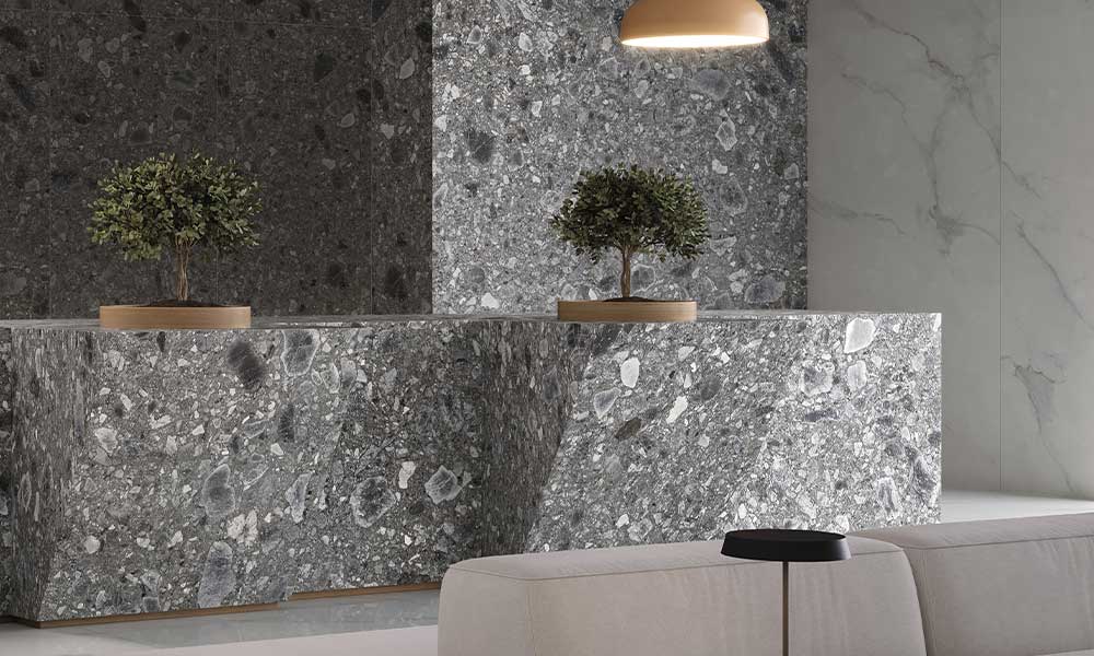 A Darkstone természetes Ceppo di grey kő textúrájával, magába foglalja a föld legtisztább és legidőtlenebb lényegét. Ez a felület, amelyet ásványi töredékek tarkítanak, szürke árnyalatokat hordoz, melyek finom részletekkel fonódnak össze, organikus és hiteles megjelenést teremtve, amely összhangban van magával a természettel.
