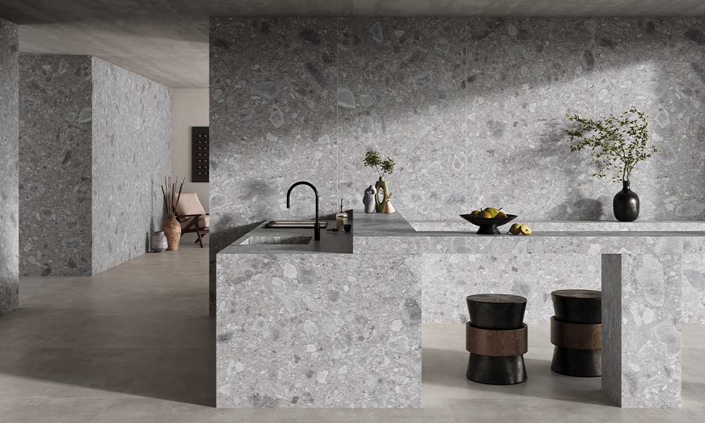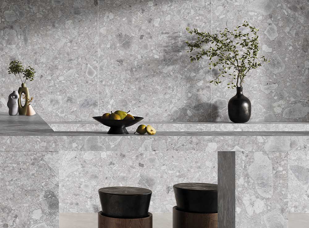 A Greystone természetes Ceppo di grey kő textúrájával, magába foglalja a föld legtisztább és legidőtlenebb lényegét. Ez a felület, amelyet ásványi töredékek tarkítanak, szürke árnyalatokat hordoz, melyek finom részletekkel fonódnak össze, organikus és hiteles megjelenést teremtve, amely összhangban van magával a természettel.