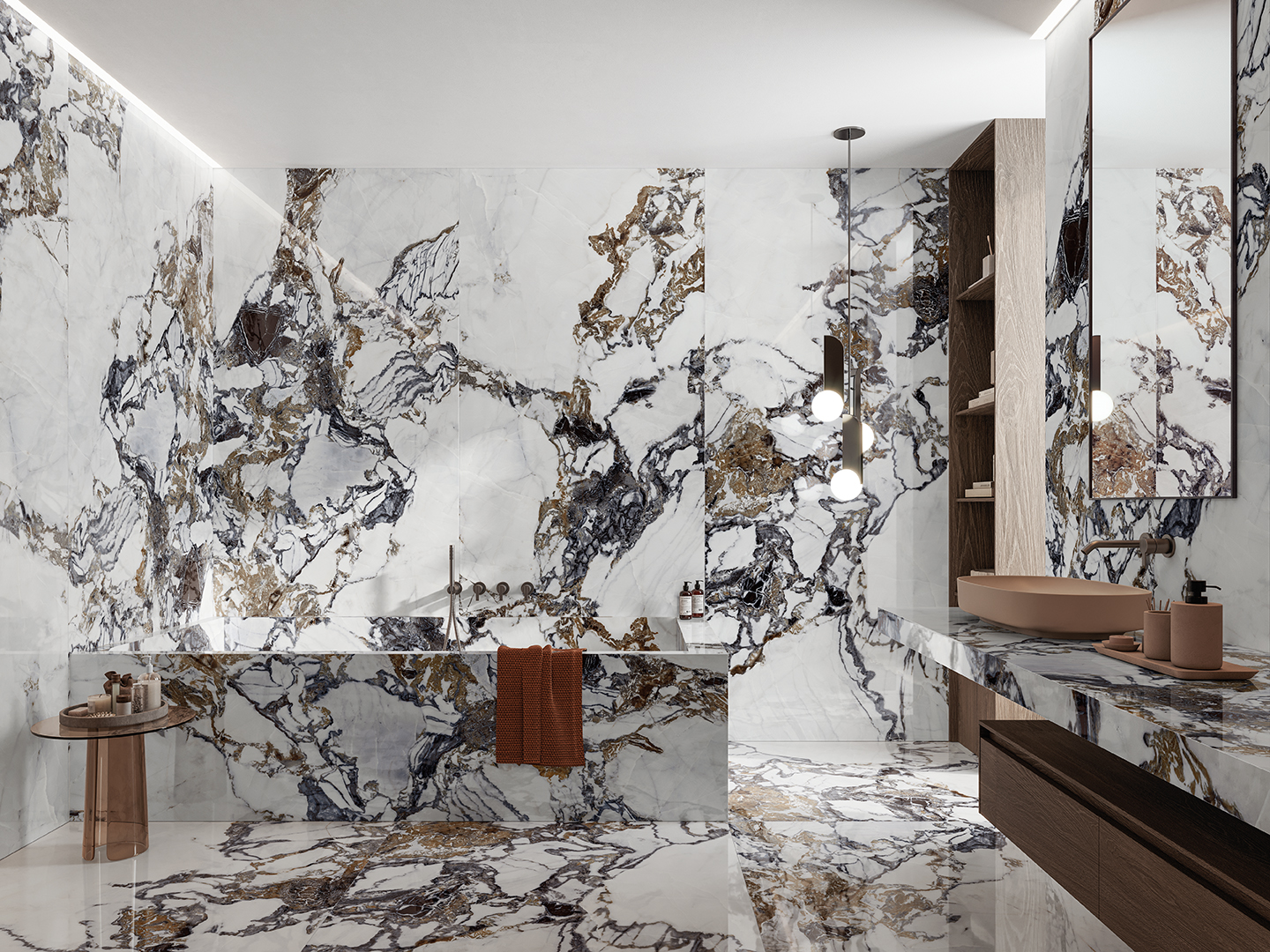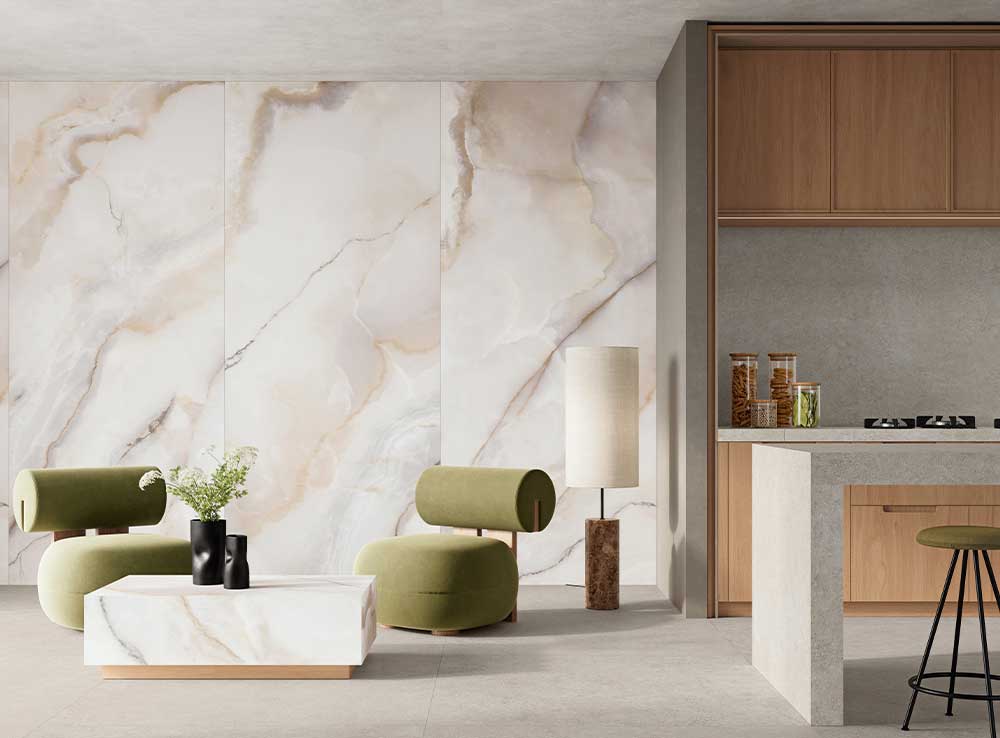 A kevesebb fuga nemcsak esztétikusabb, hanem higiénikusabb is – könnyebb tisztán tartani, és nem töri meg a tér egységét. Egyetlen lap akár egy teljes falat is lefedhet, így a végeredmény kifinomult, modern és nagyvonalú.
